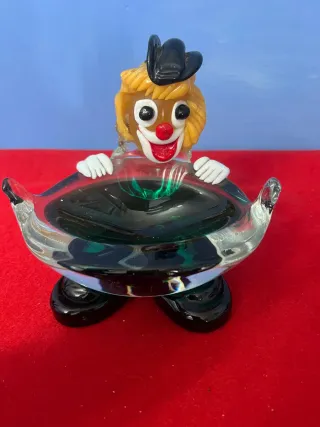Originale portacenere in vetro a forma di clown. Un pezzo unico per arredare con un tocco di allegria. Oggetto vintage anni 80 - Realizzato in vetro di Murano soffiato. - Dettagli colorati del clown. - Base nera lucida.