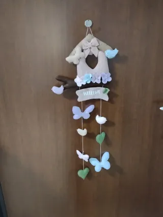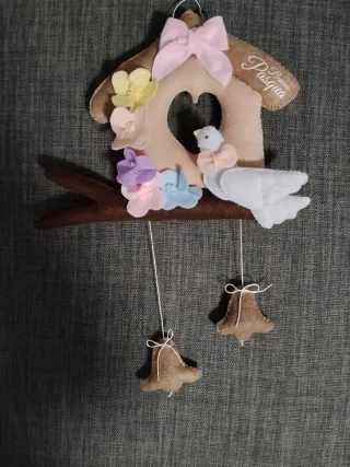 Delizioso fuori porta a tema primaverile, realizzato interamente in feltro. - Decorazione a forma di casetta con uccellini e farfalle. - Fiocchi e fiori colorati. - Scritta WELCOME centrale. - Pendenti con cuori e farfalle.