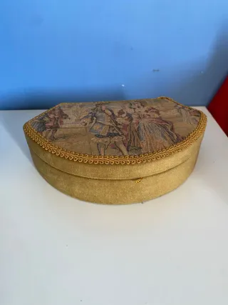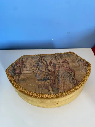 Elegante portagioie di origine francese, con una decorazione tessile che raffigura una scena d'epoca. Oggetto risalente agli inizi del Novecento - Decorazione con scena d'epoca. - Bordatura dorata. - Forma esagonale.