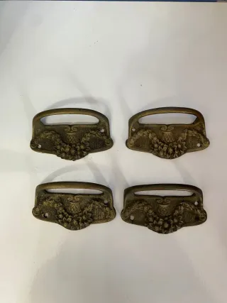 Set di quattro maniglie in bronzo antico, perfette per dare un tocco vintage ai tuoi mobili. - Design con motivo floreale e stemma centrale. - Materiale: Bronzo. - Finitura anticata. - Ideali per cassettiere, armadi o porte.