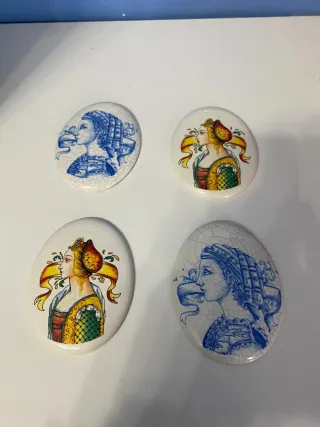 Set di 4 miniature in porcellana di Capodimonte. - Raffigurano profili di donne con copricapi e abiti d'epoca. - Due pezzi sono decorati in blu, gli altri due a colori.