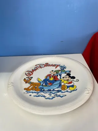 Piatto in ceramica con decorazione natalizia Disney. - Personaggi: Topolino, Paperino, Pippo e Pluto. - Scena: i personaggi su una slitta nel bosco innevato. - Scritta Walt Disney in rosso e blu. - Logo Disney in basso a sinistra. - Bordi decorati con motivi floreali in rilievo.