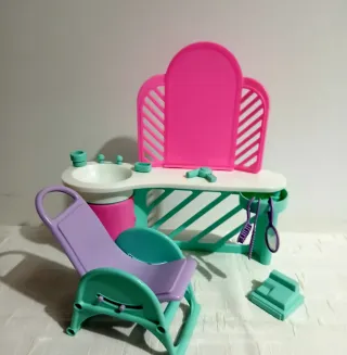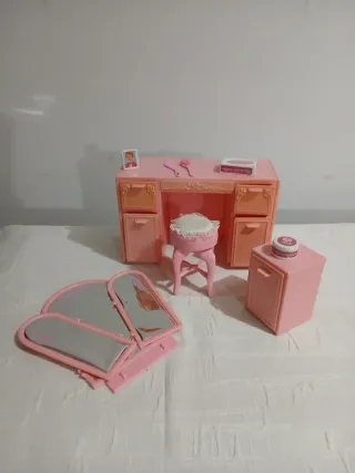 Parte del PlaySet serie "Living Pretty" di Barbie Mattel, usata, originale. 1987 - Include specchio triplo: ganci rovinati - Sgabello imbottito. - Mobiletto con cassetti. - Accessori vari come pettine e scatolina Colore in parte ingiallito..