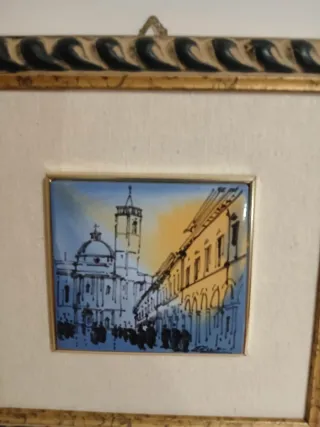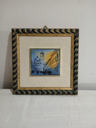 Bellissimo quadro con mattonella in ceramica dipinta a mano. - Raffigura una scena urbana con architetture. - Cornice in legno decorata - quadro cm 24x24 - mattonella cm 10x10