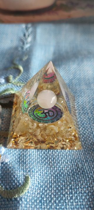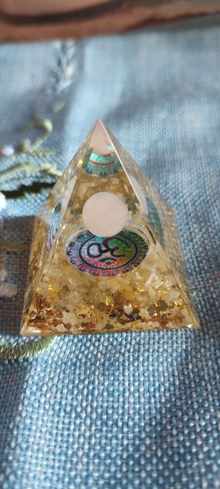 piramide Orgonite con pietra tonda luna bianc proprietà bene ottime e quarzo citrino proprietà:Promuove l'affermazione lavorativa; apporta energia agli slanci della volontà, della progettualità e dell'autorealizzazione; aiuta a concretizzare idee e progetti. Sfera emotiva. Stimola il coraggio ed il gusto di vivere; apporta gioia, ottimismo, vitalità.Pirámide de orgonita con piedra luna blanca redonda, excelentes propiedades y propiedades del cuarzo citrino: Promueve la afirmación laboral; aporta energía a los impulsos de voluntad, planificación y autorrealización; ayuda a materializar ideas y proyectos. Esfera emocional. Estimula el coraje y