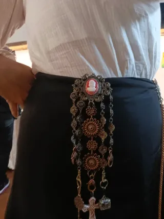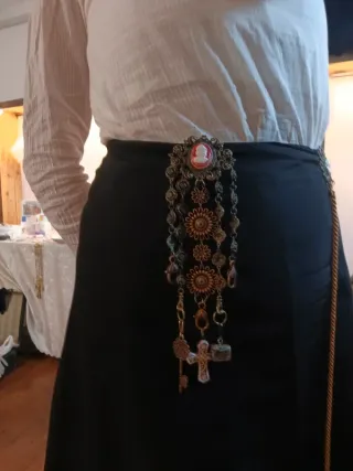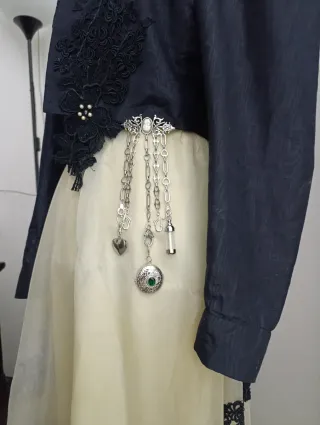 Chatelaine steampunk o vittoriana, con catene in ottone e gancio per cintura o gonna. Tre accessori, scatolina a forma di bauletto, chiave anch'essa finemente decorata e croce in ceramica. Particolare, unica nel suo genere, ispirata dalle chatelaine di impronta barocca.