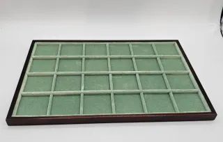 Vassoio da collezione per monete pregiate, ideale per conservare e esporre la tua collezione. - Struttura in legno scuro. - Rivestimento interno in velluto verde. - Scomparti multipli per organizzare le monete.24 piazze da 47mm Colore velluto verde acqua costruito in legno massello con foderatura interna in velluto di prima qualità