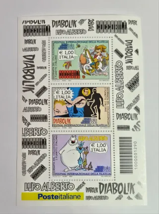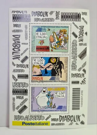 Foglietto filatelico commemorativo dell'Italia del 2009, dedicato ai personaggi Diabolik e Coccobill. - Edizione speciale per la Giornata del Collezionismo. - Valore nominale di € 1,00 per francobollo. - Illustrazioni dei fumetti italiani.