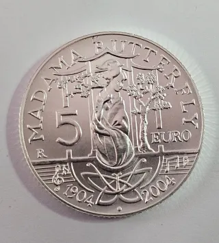 Moneta commemorativa da 5 Euro della Repubblica Italiana del 2004, dedicata a Madama Butterfly. - Anno di emissione: 2004 - Valore nominale: 5 Euro - Tema: Madama Butterfly - Paese: Italia