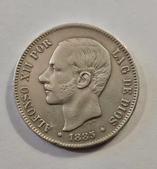 Moneta da 5 Pesetas spagnola, con l'effigie di Alfonso XII, anno 1885. - Dritto: REY CONST. DE ESPAÑA con stemma coronato tra due colonne. - Rovescio: 5 PESETAS con data e iniziali M. M.