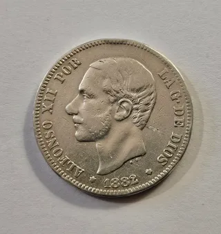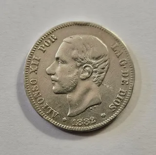 Moneta da 2 Pesetas spagnole del 1882, con l'effigie di Alfonso XII. - Anno di conio: 1882 - Valore nominale: 2 Pesetas - Paese: Spagna - Sovrano: Alfonso XII