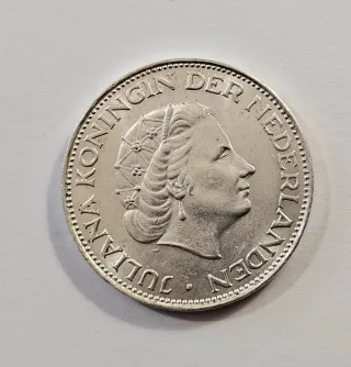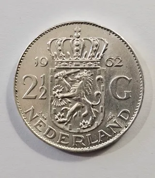 Moneta da 2,5 Gulden dei Paesi Bassi del 1962. - Raffigura la Regina Giuliana. - Dritto: JULIANA KONINGIN DER NEDERLANDEN.