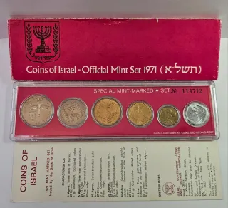 Set ufficiale di monete di Israele del 1971. - Include 6 monete. - Monete coniate dalla Israel Government Coins and Medals Corporation. - Anno ebraico 5731 stampato in lettere ebraiche.