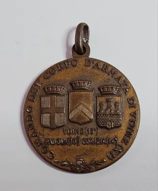 Medaglia in bronzo del Comando del Corpo d'Armata di Udine. - Tre stemmi araldici con corone. - Scritta COMANDO DEL CORPO D'ARMATA DI UDINE. - Nomi di città e numeri romani: VdINE (15°), PADOVA (10°), CORIZIA (14°), (XI). - Motivo floreale nella parte inferiore.