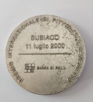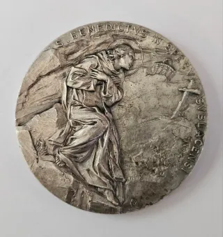 Medaglia raffigurante San Benedetto nel suo eremo.zin metalli argentato ,peso:grammi 114,50 diametro mm 60 - Incisione S. BENEDICTVS IN SPECÚ SVBLACENSI - Dettagli di San Benedetto in preghiera - Elementi come una cesta e una croce - Marchio di fabbrica visibile in basso a destra