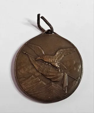 Medaglia in bronzo commemorativa del corpo degli Alpini, con data 8 Ottobre 1909.Peso grammi8,15 ,diametro mm27 - Raffigurazione di un'aquila con bandiera. - Motto SEMPRE AVANTI SAVOIA inciso. - Design con montagne sullo sfondo.