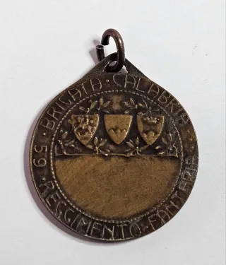 Medagliain bronzo commemorativa del 59° Reggimento Fanteria.Peso grammi9,45-diametro mm27 ,originale d'epoca - Raffigura tre scudi araldici. - Presenta la scritta BRIGATA CALABRIA e 59° REGGIMENTO FANTERIA.
