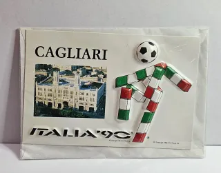 Souvenir del Mundial de Fútbol Italia '90, dedicado a Cagliari. Incluye una imagen del Stadio Sant'Elia y un diseño con los colores de Italia. - Diseño con los colores de la bandera italiana. - Imagen del Stadio Sant'Elia. - Tema: Mundial de Fútbol Italia '90.