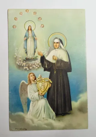 Cartolina raffigurante Santa Giovanna Antida Thouret. - Immagine religiosa con angeli e la Madonna. - Raffigurazione di Santa Giovanna Antida Thouret con stemma.