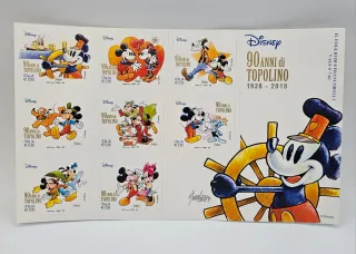Foglietto di 8 francobolli celebrativi per i 90 anni di Topolino, emessi nel 2017. - 8 valori da 0,95€ ciascuno. - Illustrazioni di Topolino e altri personaggi Disney. - Edizione italiana.