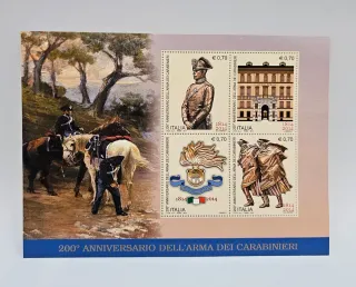 Foglio di francobolli celebrativo per il 200° Anniversario dell'Arma dei Carabinieri. - Quattro francobolli da €0,70 ciascuno. - Illustrazioni storiche e simboli dell'Arma. - Anno di emissione: 2014.