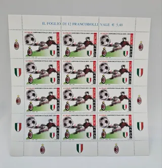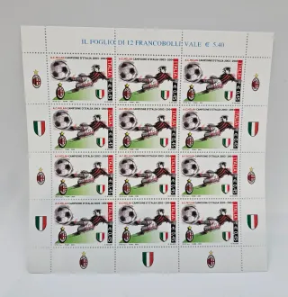 Foglietto di 12 francobolli celebrativi della vittoria del Campionato Italiano 2003-2004 da parte dell'A.C. Milan. - 12 francobolli. - Valore singolo: € 0,45. - Valore totale foglietto: € 5,40. - Tema: A.C. Milan Campione d'Italia 2003-2004.