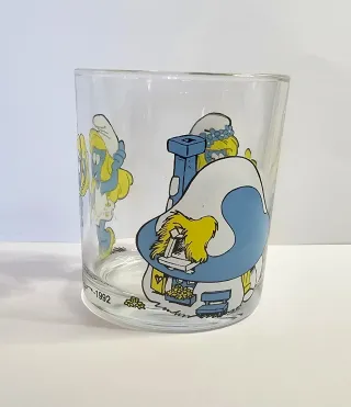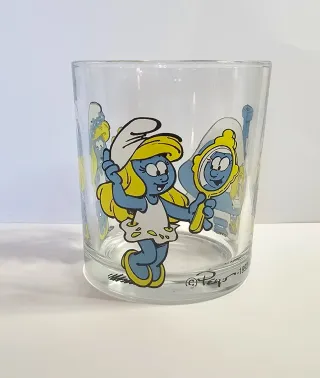 Bicchiere in vetro con Puffetta, personaggio dei Puffi, realizzato per Nutella. - Illustrazione di Puffetta con specchio. - Anno di produzione: 1992. - Marchio: Ferrero.