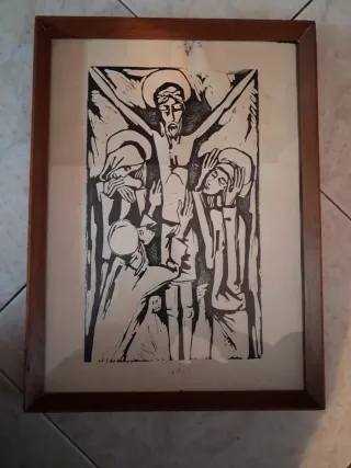 Quadretto raffigurante la Crocifissione di Gesù, xilografia/stampa, completo di cornice. Oggetto a soggetto religioso, ideale per collezionisti o per arredare ambienti classici. Dimensioni: Stampa: circa 20 × 33 cm Cornice: circa 37 × 26 cm Anno:50/60 Condizioni: ottime. Presente una leggera usura nella parte bianca nel foglio,dipinto perfetto nessuna imperfezione come anche la cornice come visibile in foto. Vedere foto per i dettagli e lo stato reale dell’oggetto.