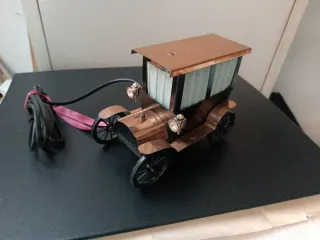 Lampada decorativa a forma di auto d'epoca. - Finitura in rame lucido. - Dettagli in metallo e plastica. - Elementi decorativi color teal.