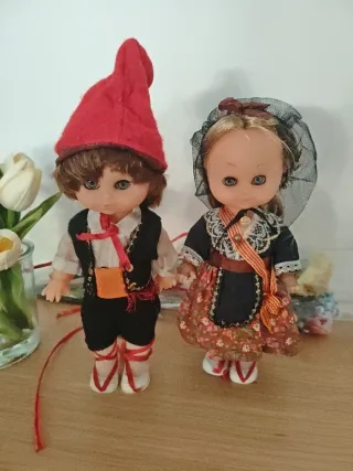 Adorabile coppia di bambole regionali in stile vintage, che rappresentano costumi tradizionali catalani. Dettagli di nastri e ricami. - Bambola con cappello rosso e gilet nero. - Bambola con velo e gonna stampata.