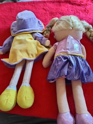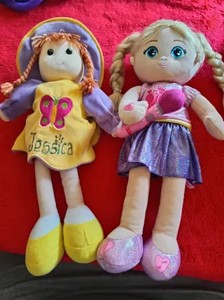 Due adorabili bambole di peluche, perfette per collezionare o regalare. Una bambola indossa un vestito giallo con una farfalla e il nome Jessica ricamato. L'altra bambola ha un vestito viola brillante e tiene un microfono. Entrambe le bambole hanno i capelli intrecciati e scarpe abbinate ai loro abiti.