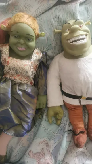Set di bambole di Shrek e Fiona, personaggi del film. Segni d'uso - Bambola di Fiona con vestito. Bambola di Shrek con il suo caratteristico abbigliamento.