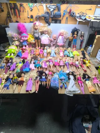 Lote di 20 bambole di stili e dimensioni diverse. Alcune sono di corpo morbido e altre di plastica dura, con capelli lunghi e colorati. Bambole con vestiti vari. Accessori inclusi in alcune. Ideale per collezionisti o per giocare.