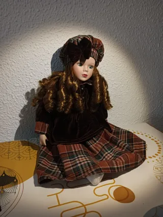Bellissime bambole in porcellana con un abito a quadretti nei toni del bordeaux e del bianco, ornato con pizzo e fiocco. - Abito a quadretti bordeaux e bianco. - Dettagli in pizzo bianco. - Nastro in raso bordeaux. - Include cappello abbinato