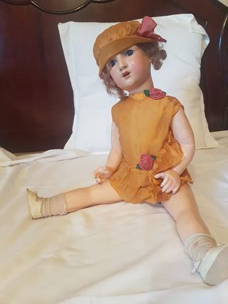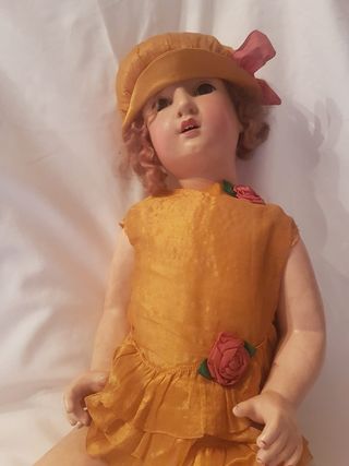 Bambola di porcellana, originariamente destinata all'uso infantile e oggi di interesse per il collezionismo di bambole antiche di biscuit e composizione. Testa di porcellana dipinta a mano, occhi di cristallo con meccanismo basculante, bocca aperta con denti di porcellana. Corpo in composizione di carta pesta policroma, articolazione su spalle, gomiti, fianchi e ginocchia. Parrucca di fibra. Vestito in seta degli anni '20 con applicazioni di tulle e fiori. Cappello e scarpe abbinati. Scatola originale senza coperchio. Marcatura riportata sulla nuca: 8MB, Morimura Brothers (Giappone 1910-1930).