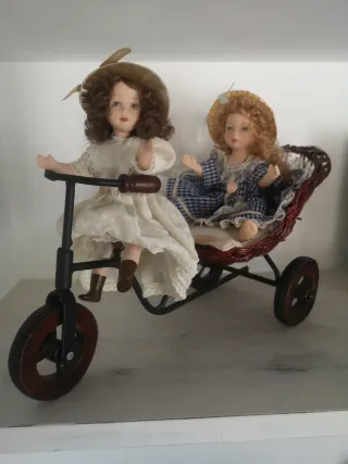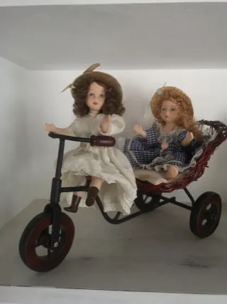 Questo delizioso passeggino mini per bambole PORCELA FINA BISCUIT ha uno stile vintage. Include due bambole. Passeggino in vimini con ruote. Ideale per collezionisti.