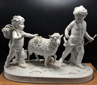 Grande scultura in porcellana Biscuit bianco raffigurante una scena pastorale con due cherubini e pecore