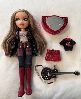 Bambola Bratz Cloe Rock Angelz del 2005. Include accessori. - Giacca nera brillante. - Pantaloni jeans con dettagli rossi. - Stivali rossi. - Gonna rossa con stampa. - Maglietta nera con testo. - Chitarra nera con tracolla. - Base rossa per la bambola. *SONO BAMBOLE USATO* Faccio lotto con altri prodotti dal mio profilo. NON TRATTA IN MANO SOLO SPEDIZIONE CON POSTE ITALIANE O GLS