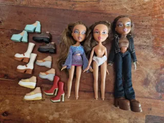 Conjunto di bambole Bratz con vari accessori. Include tre bambole Bratz, diversi paia di scarpe e stivali, e vari accessori per le bambole. Due hanno ciocche di capelli tagliati, non troppo evidenti. Necessita di pulizia e acconciatura. Si consegnano come mostrato nelle foto, guardare per conoscere lo stato.