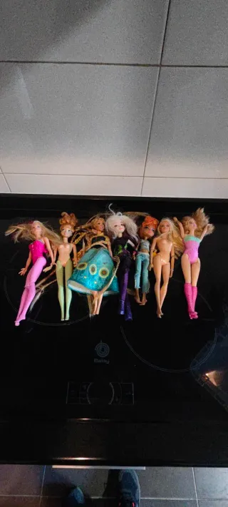 Set di bambole da recupero che comprende anche una Bratz Cloe del 2001 e una Bambola Winx Tecna anno 2003-2008. Il lotto contiene in tutto 9 bambole, di cui una senza braccio e alcuni accessori per Barbie/bambole. Bambole non adatte a bambini in quanto da ripulire e risistemare. Le bambole sono per collezionisti di bambole.