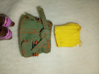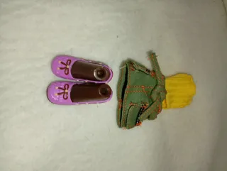 Questo set include un paio di scarpe e un abbigliamento per bambole. - Scarpe viola con fiocco. - Abbigliamento verde con dettagli arancione e giallo. Gonna, maglietta e scarpe.