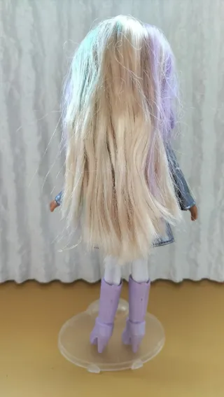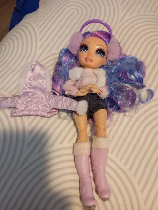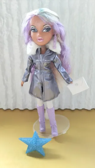 Bambola Bratz con abbigliamento e accessori. Include cappotto, paraorecchie e stivali. Capelli lunghi e ricci nei toni del viola e blu. Trucco dettagliato su occhi e labbra.