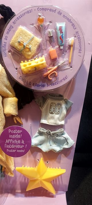 Set di abbigliamento e accessori per bambole Bratz. Include un collare/bracciale bianco, una giacca in stile pelle marrone, un top giallo brillante, una gonna jeans con cintura rossa, un pettine a forma di stella rosa, una scarpa bianca, due anelli/collane neri, un lettino bianco, un fazzoletto/lenzuolo bianco con pizzo.