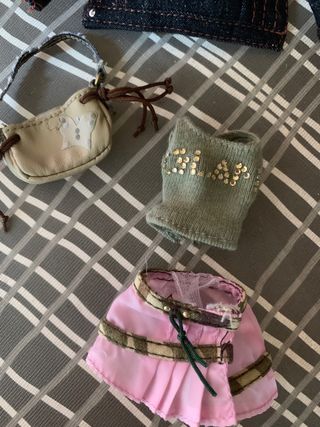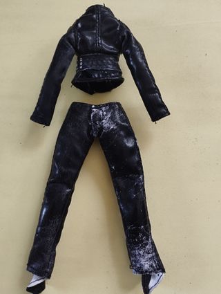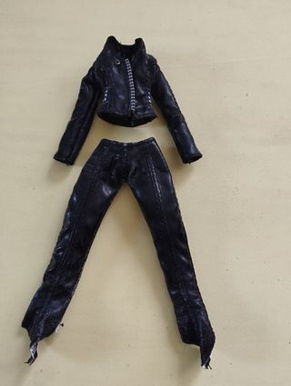 Set di abbigliamento in pelle per bambole Bratz. Include giacca e pantaloni. Le foto fanno parte della descrizione. - Giacca nera con cerniera. - Pantaloni neri con qualche segno di usura (vedere le foto).