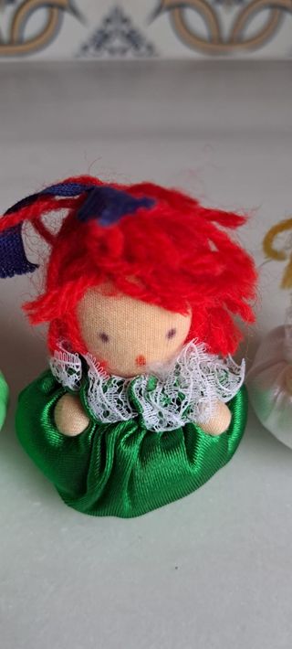 Bambole di pezza. 8€ ciascuno. 1. Bambola di pezza a forma di uovo Dimensioni: 50 cm di altezza e 25 cm di larghezza. Viso dipinto a mano. Capelli in lana, cappello in feltro, abito stampato e 9 fiocchi. 2. Bambola di pezza Lasoe. Anni '90. Altezza ca. 25 cm.