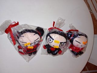 Set di bambole di pezza con i personaggi Pucca e Garu. Include tre unità. - Bambole di pezza. - Personaggi di Pucca e Garu. - Confezione da 3 unità. - Misure: 13 x 12