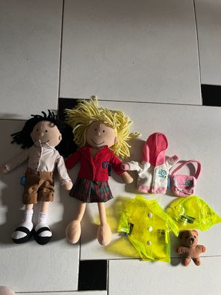 Set di vecchie bambole di pezza con vari accessori. - Bambola con capelli neri e abbigliamento di camicia, gilet e pantaloncini. - Bambola con capelli biondi e abbigliamento di giacca e gonna a quadri. - Include abbigliamento aggiuntivo e una piccola borsa. - Accessori in plastica trasparente: impermeabile e cappello. - Un piccolo orsetto di peluche.