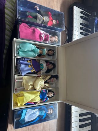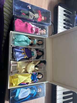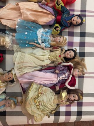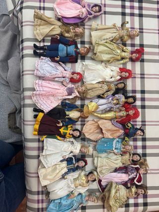 Confezione con diverse bambole delle principesse Disney e alcune Barbie. È arrivato il momento di cambiare la stanza e non voglio che finiscano in fondo a un cassetto, quindi le metto qui per farle godere ad un'altra bambina. Lo stato è abbastanza buono, forse un po' di polvere perché sono rimaste per molti anni senza uscire da una cesta. Le vendo tutte insieme.