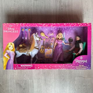 Set di bambole Disney tipo Barbie con personaggi Disney. Include Biancaneve, Cenerentola, Elsa e Rapunzel. Include anche il personaggio della Bestia e un cavallo bianco con musica e movimenti.
