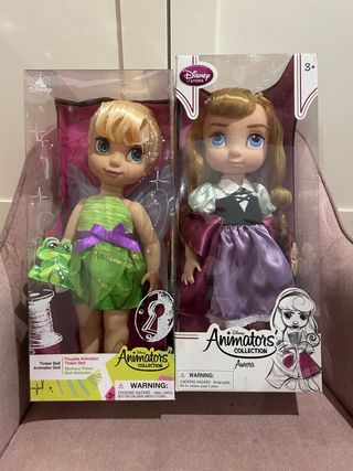 Confezione di due bambole della collezione Disney Animators. - Bambola Tinker Bell con vestito verde e ali. - Bambola Aurora con vestito viola e bianco. - Entrambe le bambole sono della collezione Disney Animators. - Spedizione con inpost e consegna a mano a Bcn. Prezzo per entrambe: 70.